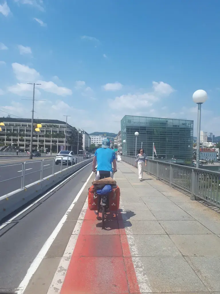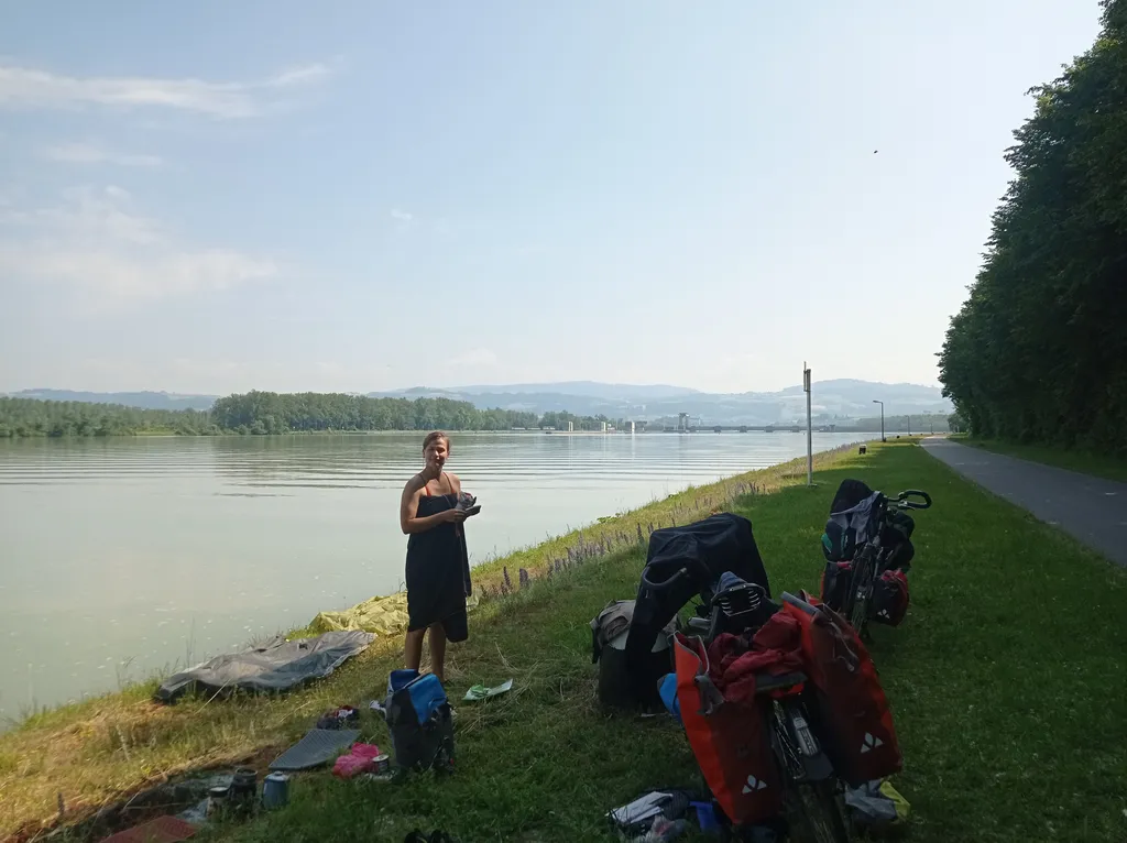 Linz dan toch weten bereiken. We gaan voor een epische lunch in het centrum: Eis als voorgerecht en een giga deelpizza als hoofdplat. Mathi speelt pizzakoerier en brengt hem veilig tot aan de oever van de Donau, waar het smikkelen wordt in het park.