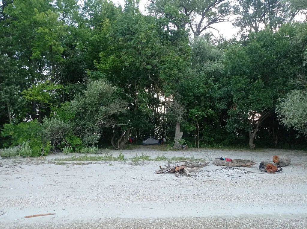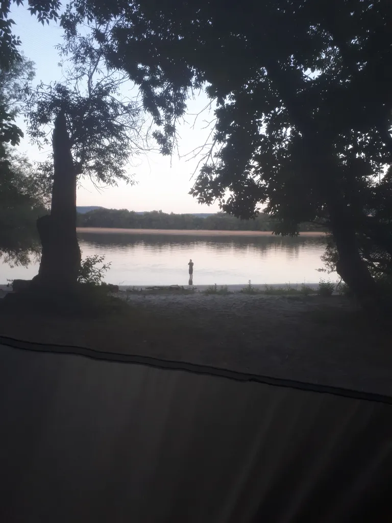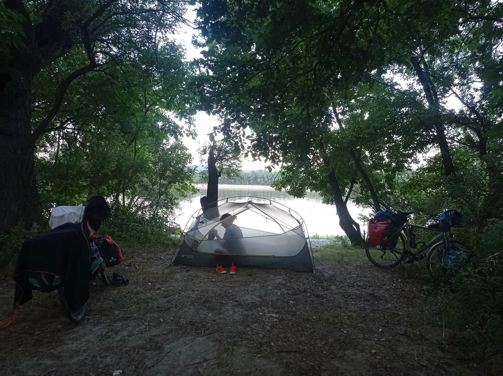 Ten avond wordt er een stevig onweer voorspelt. Wij zien er stiekem naar uit. Heel de dag hebben we langs ideale, rustige kampatieplekjes gefietst, maar nu we een plek zoeken, komen we terecht in de fancy voorwijken van Vác, volgebouwd met sjieke omheinde buitenhuisjes. Bij valavond, met een onheilspellende donkere lucht in aantocht, blijkt een slaapspot zoeken nog een opdracht te worden. Eerst een heuvel op waar we een schitterende panorma geserveerd krijgen, maar een tent pitchen is er niet mogelijk. We wagen onze kans aan de voet van de heuvel, terug aan de Duna, sluipen we een wandelweggeltje in richting moerassig overstromingsgebied. Niet ideaal,maar ondertussen is het donker en nog niet aan het regenen, dus besluiten we dat dit het gaat worden. Terwijl we de muggen van ons afslaan, zetten we gauw de tent op. Dan wandelen we nog een eindje verder door het moeras tot aan de oever van de rivier voor een zwem-was-moment en smosje met uitzicht op de nachtelijke boten. We zoeken onze tent terug in het donker, duiken er net op tijd in voor de eerste buien. Tijdens het opsteken van de felle rukwinden beseffen we dat we tussen wel heel krakende bomen staan. Het wordt dus wat bezorgd in het knarretje vallen terwijl we naar het gekraak luisteren.
