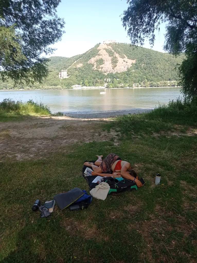 Gezappige intocht langs mooie fietspaden met strandbarretjes aan de rand van de Duna. Te middag in Nagymaros eten we een gegrild viske als lunch uitgehaald bij een étterem. Erna nog wat verder richting Verőce, waar we besluiten dat we de hitte niet langer de baas kunnen en ons dus op strand leggen. Dutten en lezen dan maar, dikkement verdiend. Het is liggen op hoog niveau, want aan de overkant van de Duna zien we prachtige groene heuvels en de Salamon Tower.