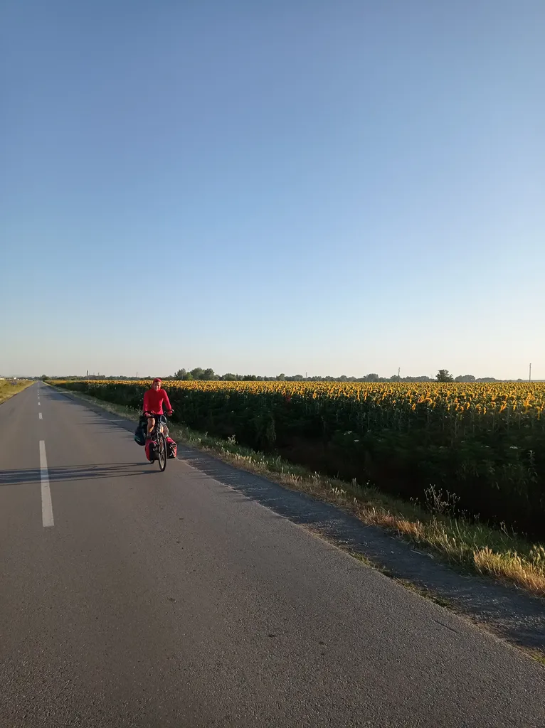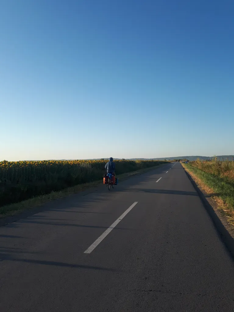 We zijn vroeg uit de veren want achter de struiken, horen we de tractor van de boomgaardboer al aanstormen. Eerst een klim tot aan Batina, langs de Kroatische wijngaarden, hier kopen we in een vroeg geopend superetteje een mini ontbijt. Vanaf daar sturen de EV6 pijlen ons langs de grote baan naar Osijek, wat 30km naast de razende camions zou betekennen. Ons niet gezien, gelukkig vinden we op de map een alternatieve dijkweg die weliswaar bijna 20km langer is, maar pakken aangenamer zal blijken te zijn. Deze weg loopt ook dwars door het natuurpark van de Drava-Dunav wetlands (Drau-Donau-delta), zal wel genieten worden zeker? De sfeer van Kroatië voelt alvast minder hartelijk door de razende chauffeurs.