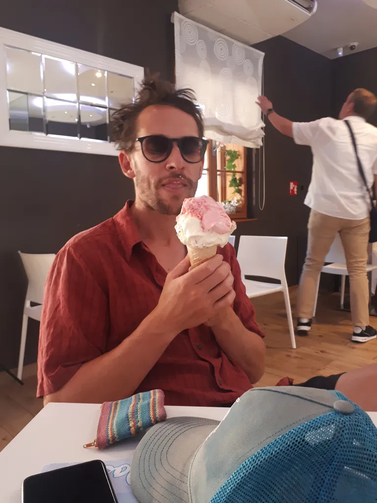 Ondertussen wederom snippeste, dus het wordt een lange siësta onder de koele bomen van het mooie stadspark aan de oever van de rivier. Voor we de stad terug kunnen uitrijden in de late namiddag, moeten we natuurlijk een ijsje eten. We komen terecht in een zaak waar ze uiterst dikke knotsen opscheppen. Niet alleen zijn de bollen groot, het is ook nog eens heerlijk. Hvala, ijszaakje!