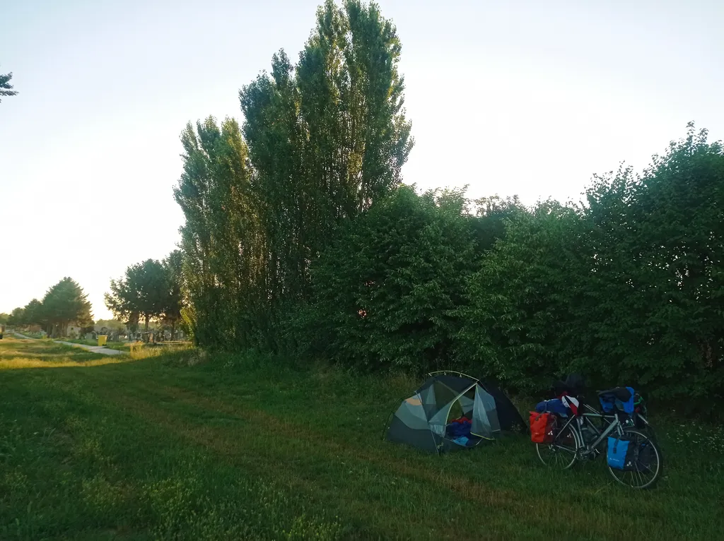 Bij de uittocht passeren we een groot kerkhof en zien daar helemaal vanachter wel een vlak braakliggend pelouzeke, waar de tent wel eens zou kunnen passen. Ze blijkt ook te passen en we kunnen het knarren inzetten.