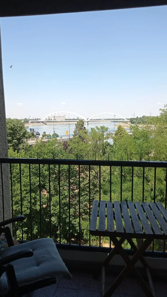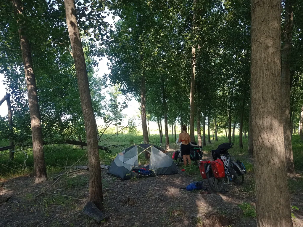 Maar een korte afstand voor de boeg, dus kunnen we ‘uitslapen’. We zijn vandaag pas rond halfje ten acht op stap en je voelt al dat het heet gaat worden. Gelukkig zijn de eerste tien kilometers over de dijk nog redelijk in de schaduw. We bollen Novi Sad (de Nieuwe Tuin) binnen en zetten ons in een gezellig blokhutje voor een koffie en kijken last-minute voor een appartementje. Eens geboekt hebben we nog een goeie drie uur te vullen voordat we mogen inchecken en dus uit de hitte vluchten. We rijden dan al maar eens tot het centrum om de pleintjes te bezichtigen en een brunchke te verorberen. Eef gaat voor gezonde courgettepannenkoekjes terwijl Mathi zijn eerste ćevapčići wegwerkt. De mensen in de stad zijn, op zijn Servisch, alweer zeer hartelijk. Er komt zelfs een man, die onze fietsen met reistassen ziet, ons spontaan een douche aanbieden.
