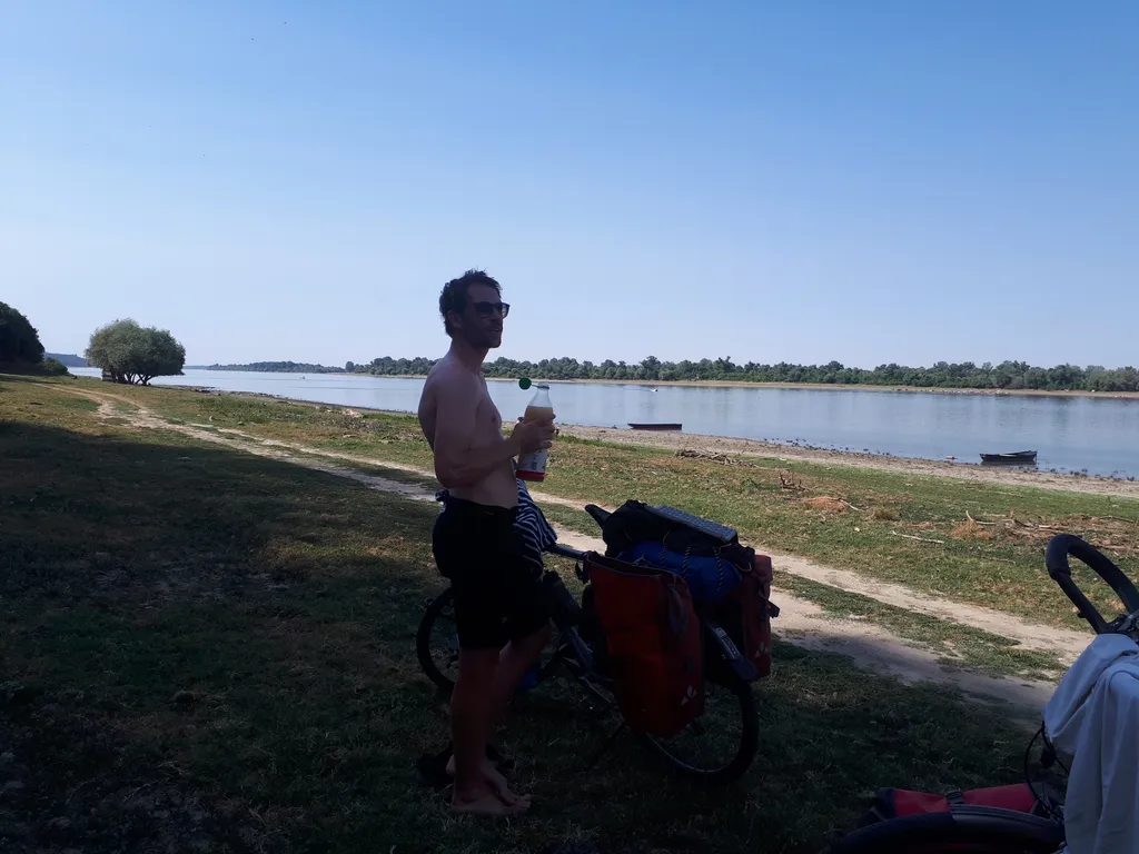 Nadat we dat bekeken hebben en echt de stad uitgefietst raken tot op de mooie dijk, is het helemaal opgeklaart en brandt de zon op onze lichamen. Gisteren namiddag genieten, nu terug noeste arbeid. We zijn nog geen 10 kilometer de stad uit en rijden al door Sremski Karlovci, een dorpje dat zo gezellig is, dat we al direct terug halt moeten houden voor een ijsje. Verder door langs enkele pittige grindwagen waar we stevig worden aangejaart door passerende Serven. Dit maakt Eef’s dag! In Stari Banovci, het oude Banovci, is het aperitief tijd en daarna het nieuwe Banovci door en op zoek naar een rustig plekje tussen de velden. Dit vinden we toch wel zeker, dus afgeknart dat er kon worden.