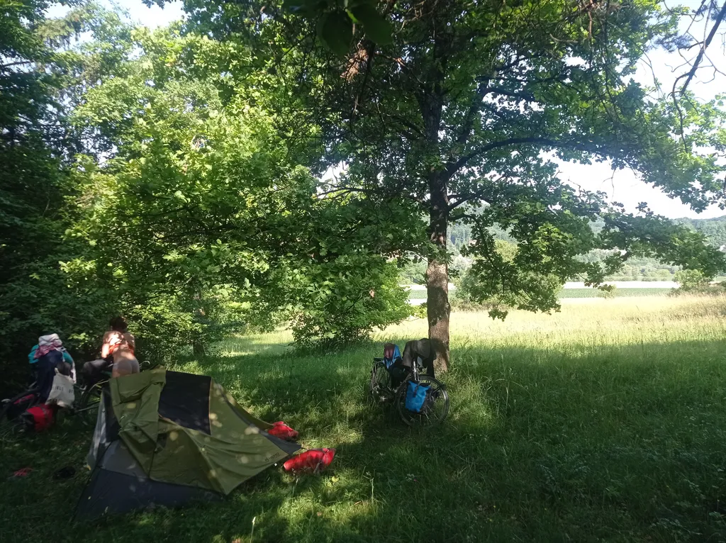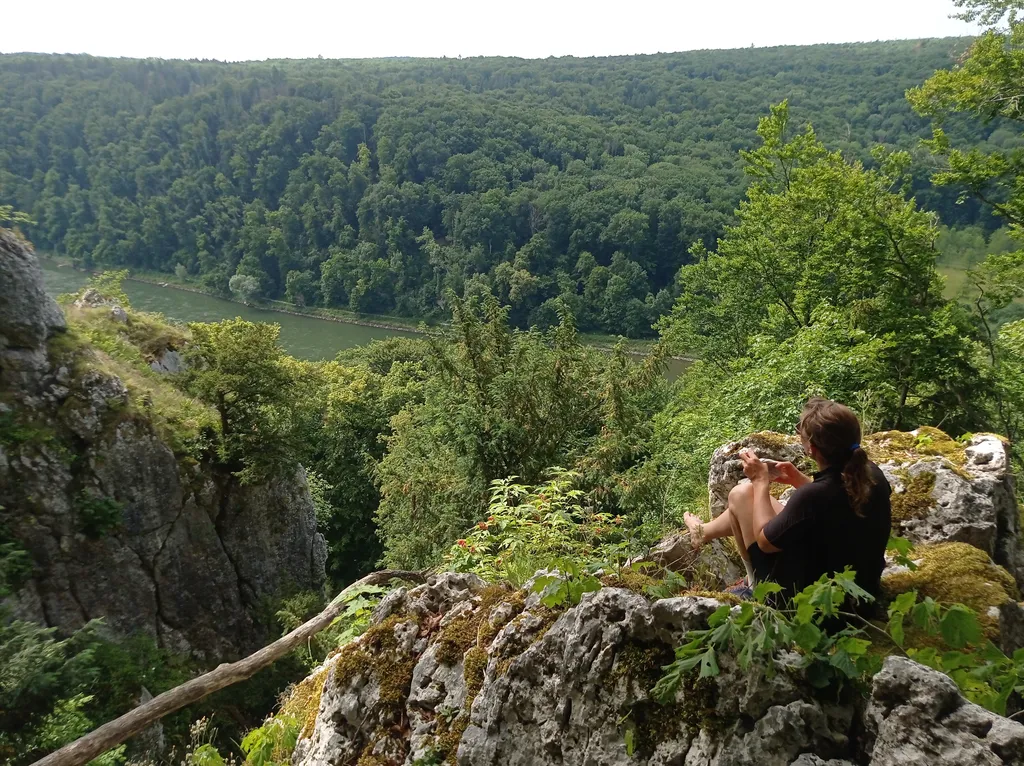 Weer veel wind dus inpikken in dat wiel. Op de middag komen we aan een stukje toeristische Donau kloof. Het is ons daar te toeristisch en we laten ons niet verleiden tot een T(ourist)T(rap)-bootje-varen. Na een snelle duik, kiezen we de fietsroute bergop en bekijken de kloof van bovenaf. Picknick met een uitzicht dus. We vervolgen en route ondanks de lobbige warmte, die ver boven Mathi’s bereik reikt.