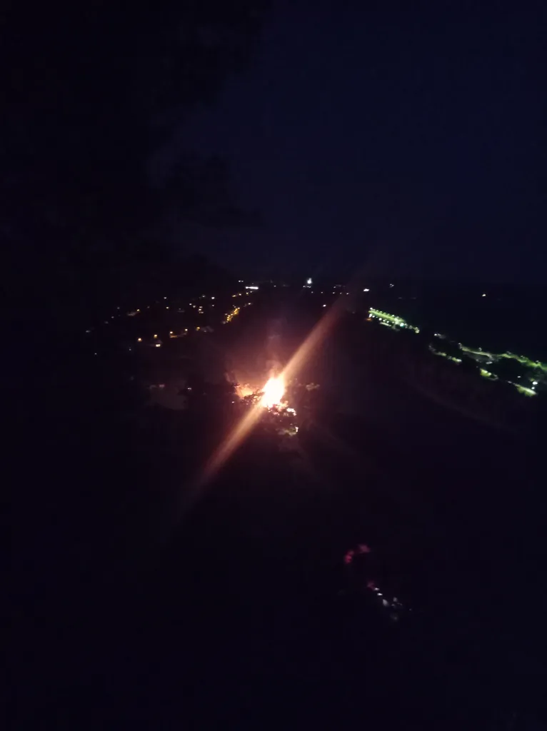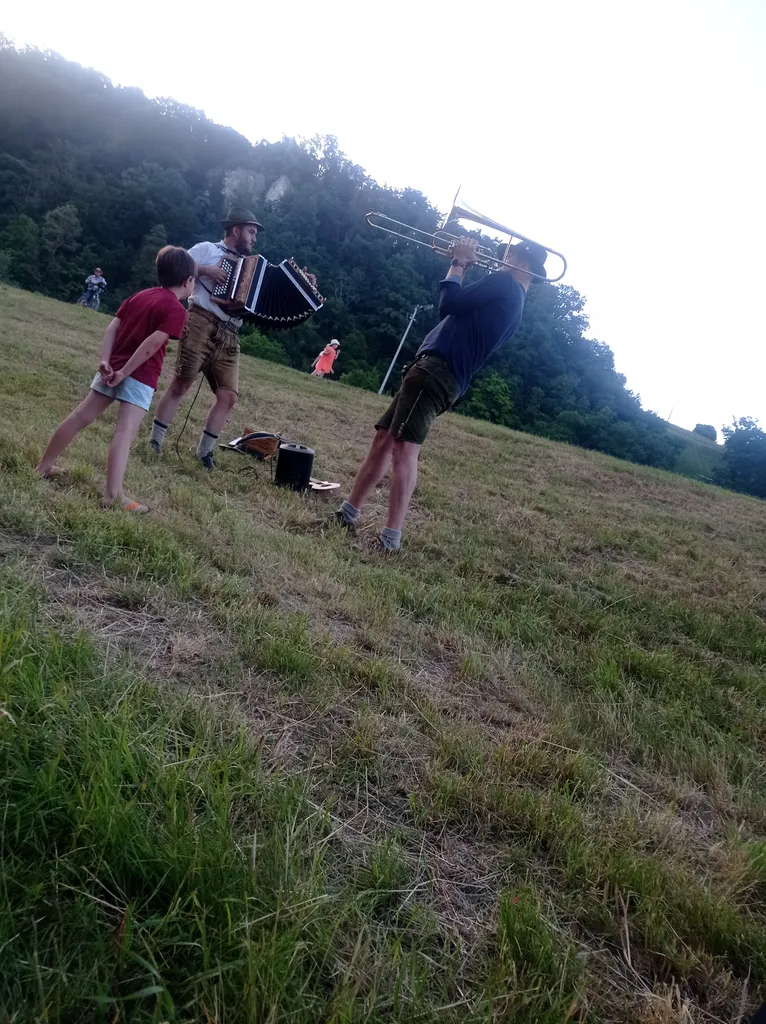 In Bad Abbach is het Eiszeit! Er komen dus wederom 4 bollen bij. Dit is een fantastisch laat “4-uurtje”, we zijn dus klaar voor de laatste 20 à 30km van de dag, in een zalig afgekoelde avondzon. Maar dit is buiten de waard gerekend. Nog geen 10km verder botsen we op een typisch Beiers hooifeest. Hier moeten we aan de kant om de lokale Feuerwehr te sponsoren. Het gadeslaan van de toestromende dorpelingen bevalt ons zeer. Uit onze ooghoeken zien we ook al dat er een giganstisch vreugdevuur gebouwd is en klaar voor ontsteking. Al snel wordt duidelijk dat dit het eindpunt van onze fietsdag wordt. We geven ons over aan de halbes en de braadwursten en genieten van de traditionele muziek van de trekzakspeler en trompetist in hun lederhozen. Na het vallen van de avond rest ons enkel nog een bosweg in te fietsen, Zelt op te smijten en knarren maar! Een ludike dag…